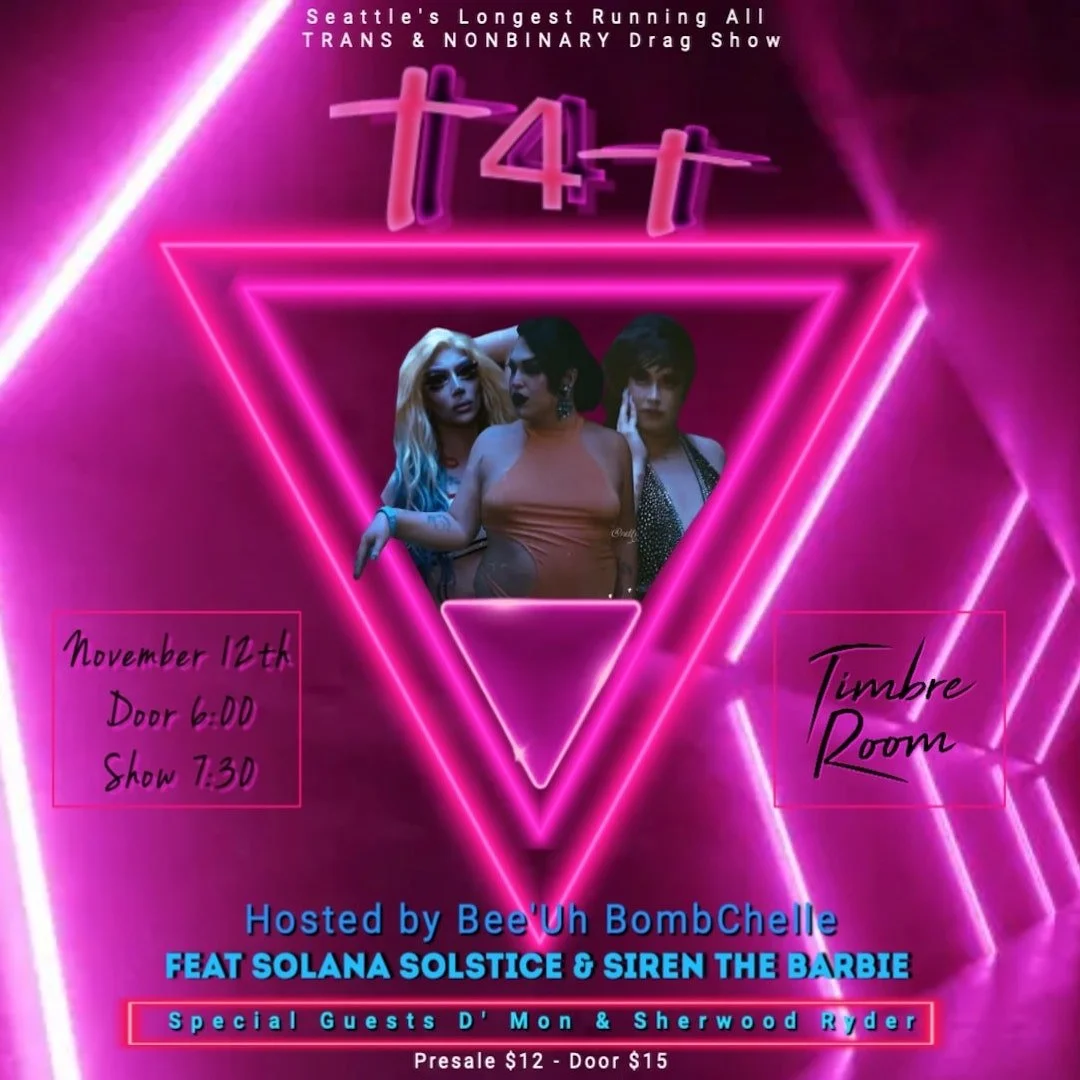 T4T: All Trans Drag Show Saturday, November 12, 2022 6:00 PM 9:30 PM Timbre Room 1809 Minor Avenue Seattle, WA, 98101 United States (map) Google Calendar ICS get tickets! Euphoria - Drag - T4TT4T is the longest running by and for all transgender and non-binary produced and casted drag show in Seattle. A one of a kind celebration of trans drag artists produced by Bee’Uh BombChelle.Performances by:Solana SolsticeSiren St. JamesD'MonSherwood RyderADV $12 // DOOR $15