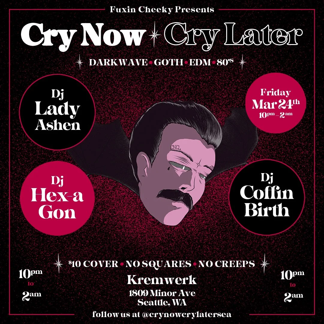 Cry Now Cry Later was started by two chicano friends looking to have a consistent dark dance night on Capitol Hill. With the help of our three resident DJ’s, Wives, Gold Chisme, and Coffinbirth and our chicano street art meets goth aesthetic, we have been able to make something quite unique. Expect rare and well known darkwave, Dark 80’s, Classic goth, industrial, and dark EDM dance cuts by some of the best local and national dark DJ’s. A dance night for the rest of us.