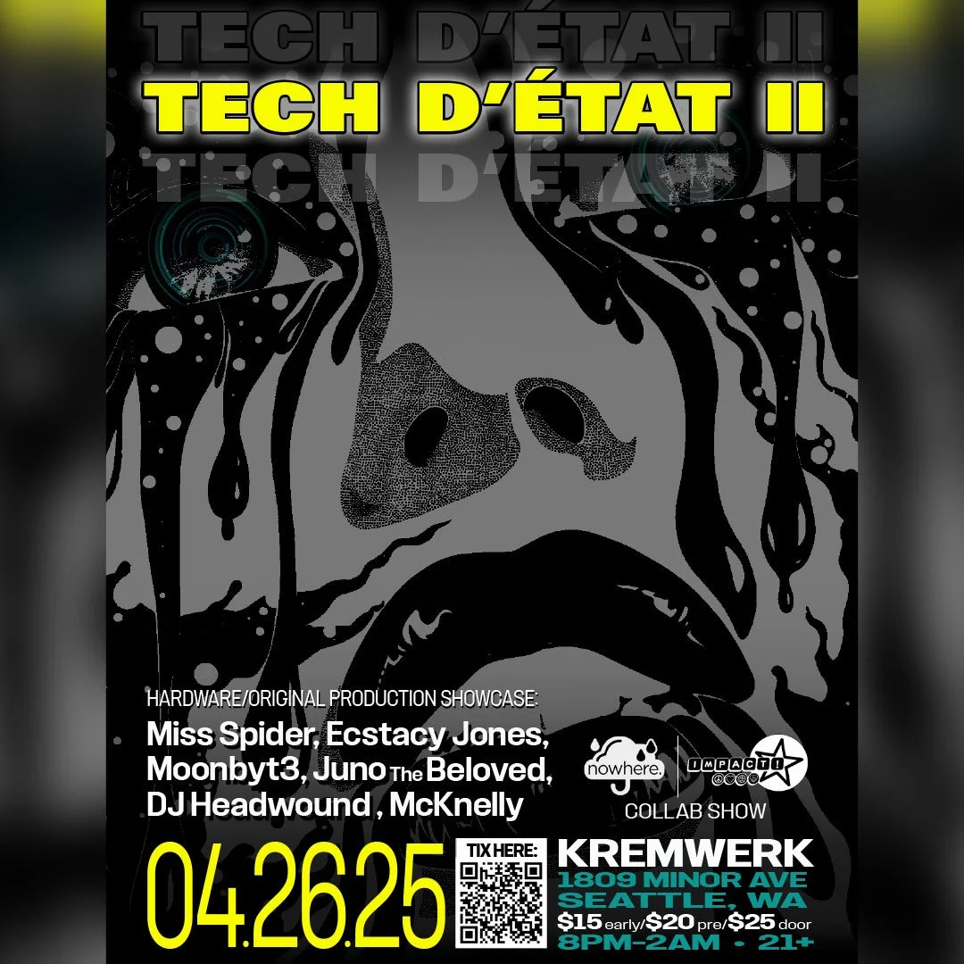 TECH D’ÉTAT II, a live hardware, and original production showcase of local techno artistry, the second of many incarnations of _nowhere._ at Kremwerk, and the bearing fruit of high frequency friendship- in partnership with Impact!