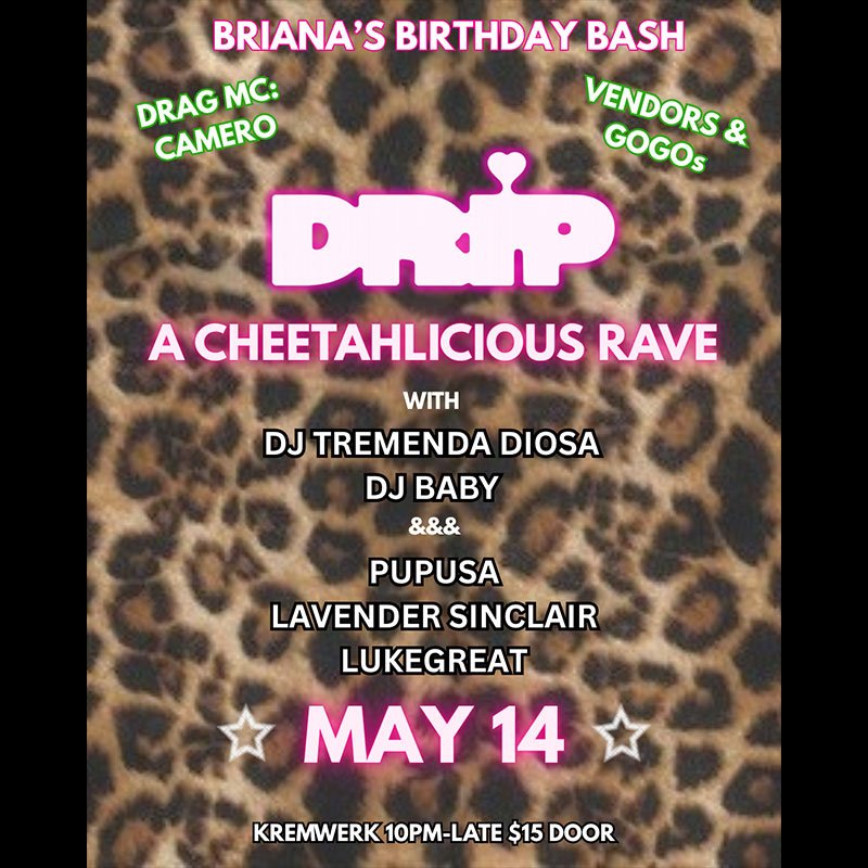 SWEAT, & DRIP with us bbs. Party the night away with some of your favorite baddies for the special edition of DRIP “CHEETAH GIRLS RAVE” for Briana’s birthday!! We got our resident MC Camero along with our seductive performers Pupusa, Lavender Sinclair, and our very own Lukegreat to help you pop your pussies all night long!! And when you aren’t shaking some ass to DJ Tremenda Diosa and DJ Baby, you can take a visit to our hot local queer vendors! From clothing to jewelry, sexy performances, and hot djs, this party is your new destination for all things DRIPPING… Curated by and for our BIPOC baddies of Seattle, All welcomed, all appreciated <3 Brought to you by Briana.exe & LUKEGREAT!!! So come on out 5/14, 10pm @ Kremwerk to sweat and DRIP with us here, Kremwerk’s hottest new party.